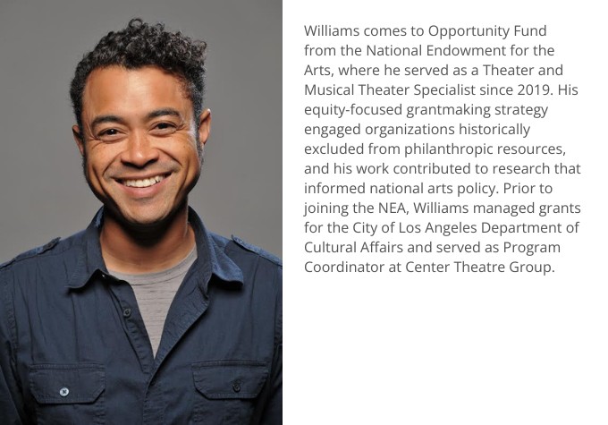 At a time when artistic freedom faces mounting threats and arts funding appears to be on the decline, the creation of the Program Officer/Arts role and Williams’s appointment signals Opportunity Fund’s deepening commitment to the arts, protecting creative autonomy, and supporting arts organizations on their own terms.